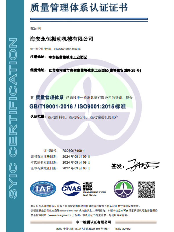 當前所在的位置:海安永恒振動機械有限公司 >> 資質證書 >> 質量管理體系認證證書