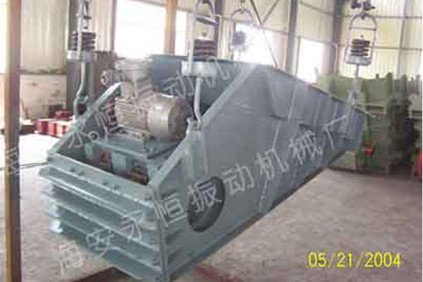 自同步慣性振動給料機是由給料槽體、激振器、彈簧支座、傳動裝置等組成。